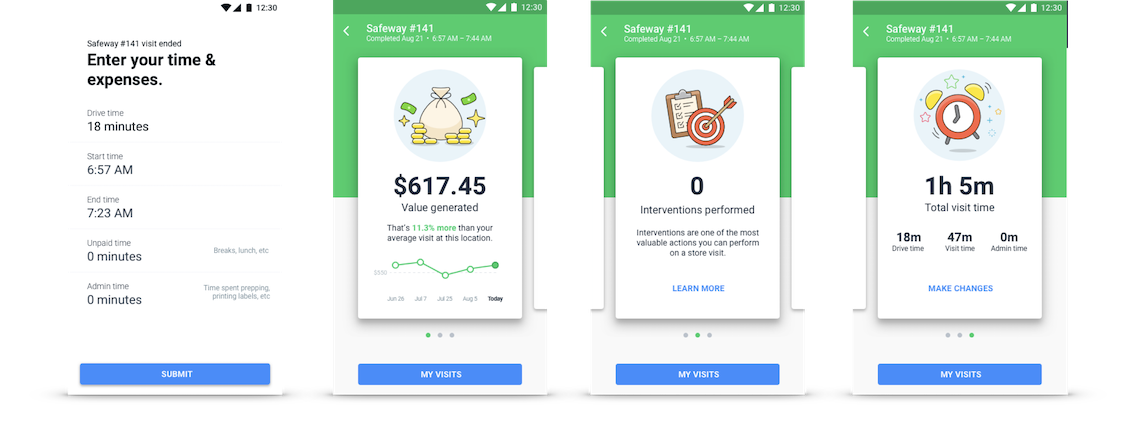 A new end visit flow allowed reps to quickly log their time and review the outcome of their store visits right in the app instead of in a monthly spreadsheet.