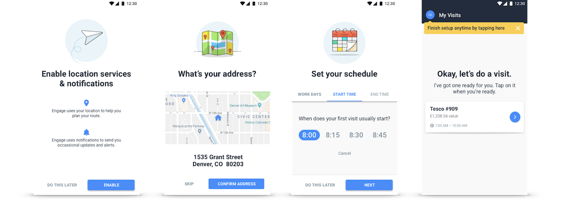 I created an onboarding flow for new reps that allowed a large chunk of in-person training to happen right in the app. By capturing a few key details, the app was able to help reps seamlessly plan their routes, create flexible schedules, and effortlessly prioritize stores and tasks with the highest value.