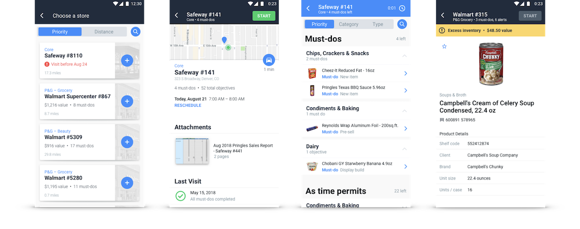 Task and location language varied by client and retailer. If you’re checking inventory levels for Frito Lays in a Walmart, it needs to be logged in the “Snacks” section of the app; the same task in a Kroger goes into “Cookies, Crackers, and Chips.” This led to a ton of frustration and time wasted hunting for the right thing.