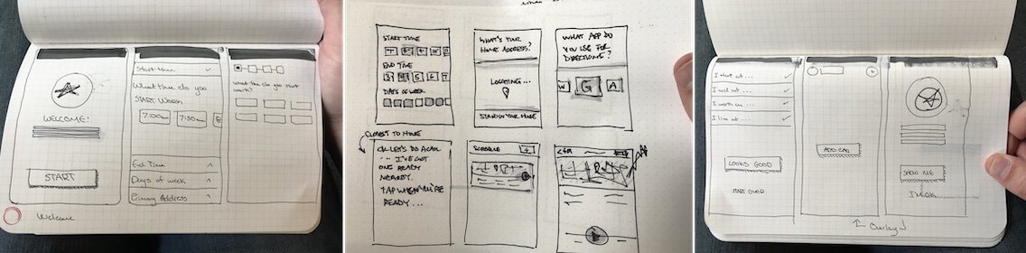 Once we had some signal that the flow was correct, we started thinking about what the app might look like and how it should work. I organized a jam session with two other designers, where we sketched out ideas on what the key flows might look like.